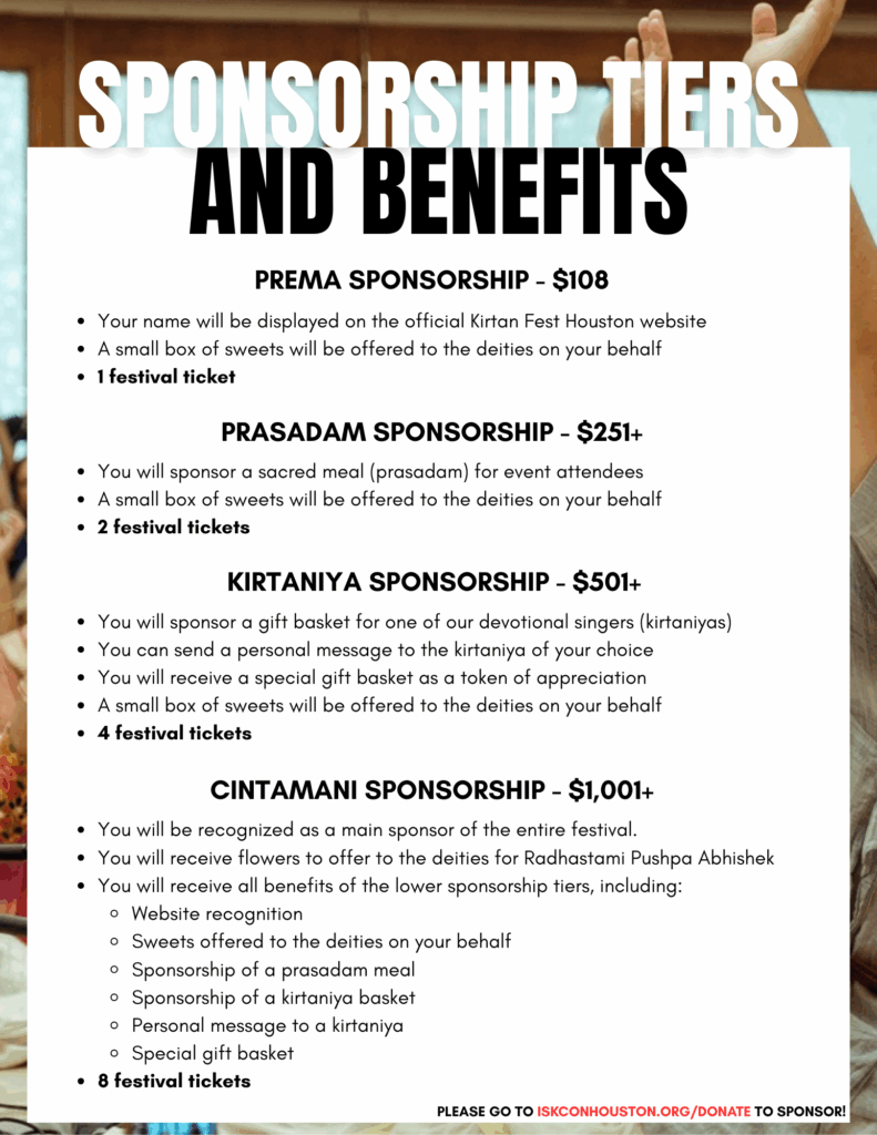 - KIRTANIYA level ($501+) – Sponsor gift basket for a Kirtan Singer, Receive a gift basket, Sweets offered to Deities on your behalf, 4 tickets