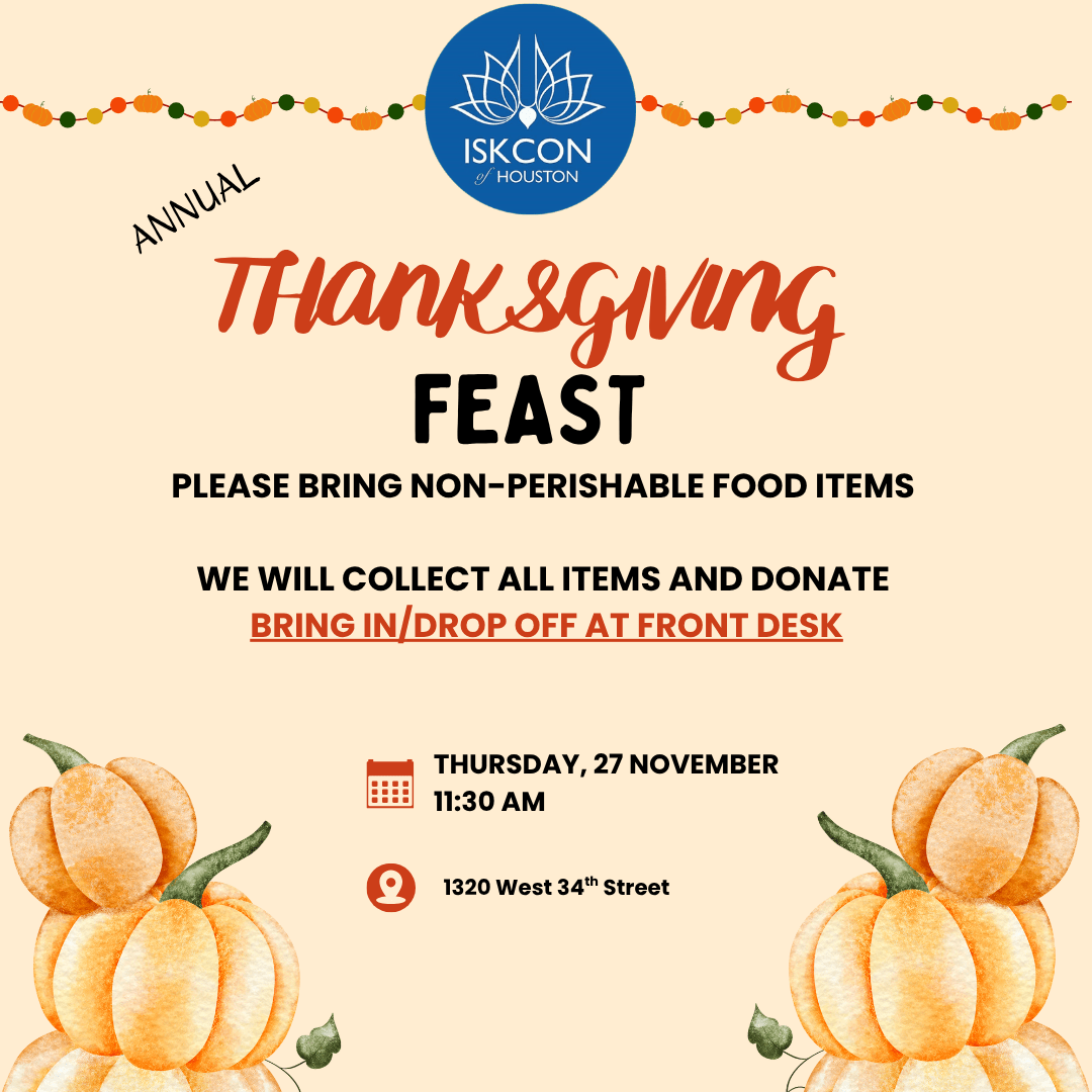 Our annual tradition of Thanksgiving Feast. Everyone is invited. Bring non-perishable (non-refrigerated) food items for donation. We are collecting donations through Thanksgiving