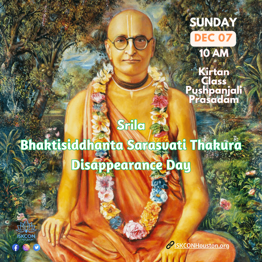 Disappearance day of Srila Bhaktisiddhanta Sarasvati Thakur Fasting till noon today. 10:00 AM - Kirtan 10:35 AM - Je anilo (bhajan)10:45 AM