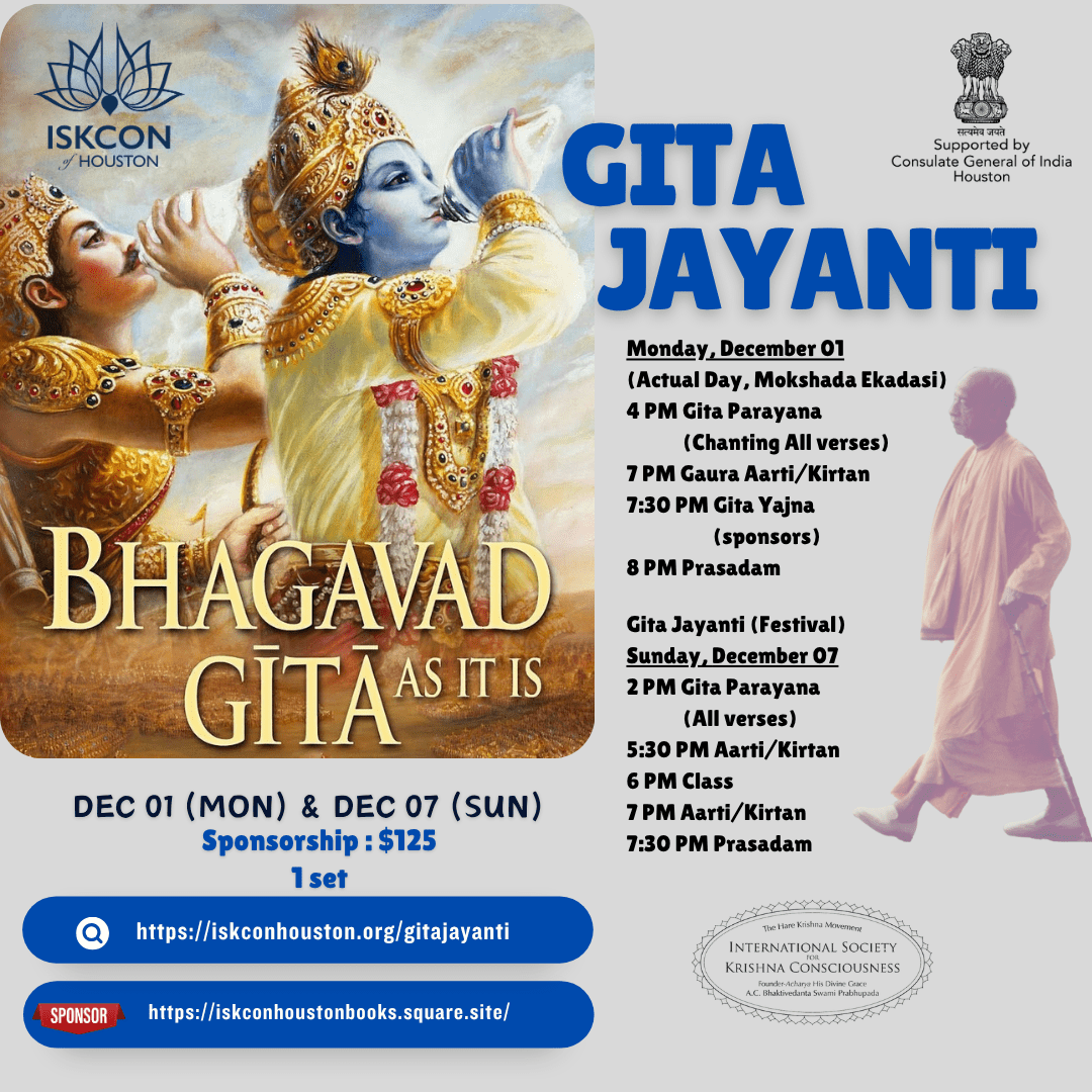 Gita Jayanti - Advent of Srimad Bhagavad Gita - Mokshada Ekadasi (Fast from grains) Supported by: Consulate General of India Houston Monday,